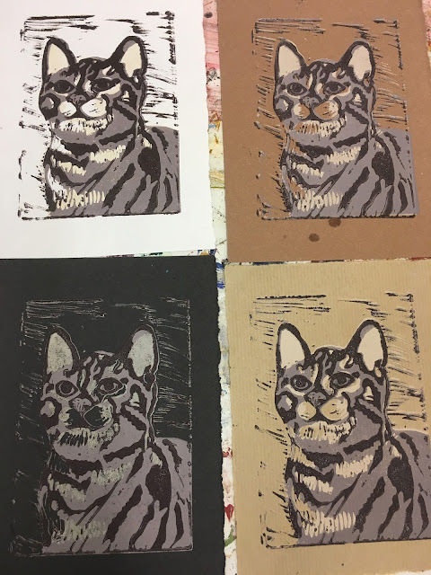 We moved on the reduction lino cuts today. Already we have some experiments with texture and colour combinations taking place.